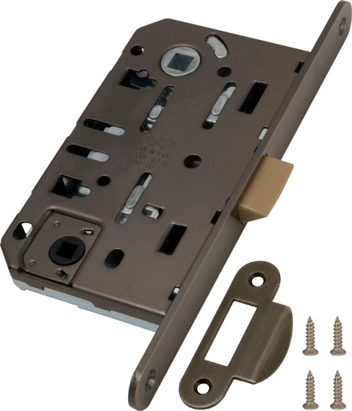 Замок врезной бесшумный B01102.50.12.567 с защелкой WC серии MEDIANA EVOLUTION предназначен для установки в межкомнатные двери. В комплектацию входит ответная планка B01000.13.12 короткая с загнутым язычком. Замок подходит для левых и правых дверей. Более тихий замок благодаря новой конструкции и новым внутренним компонентам. Бесшумная пластиковая защелка с двойным наклоном может фиксироваться ключом внутри замка (при перевозке деревянного полотна). Новая защищенная патентом система поворота защелки. Цвет: античная бронза. Упаковка: блистер.